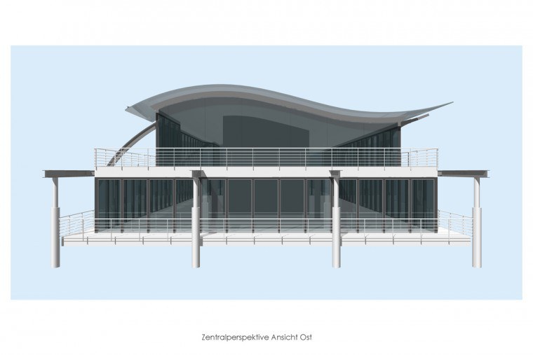 Der obere Abschluss wird mittels einer filigranen Stahlkonstruktion mit einer Überwölbung in der Anmutung einer harmonisch geschwungenen Welle erzeugt.